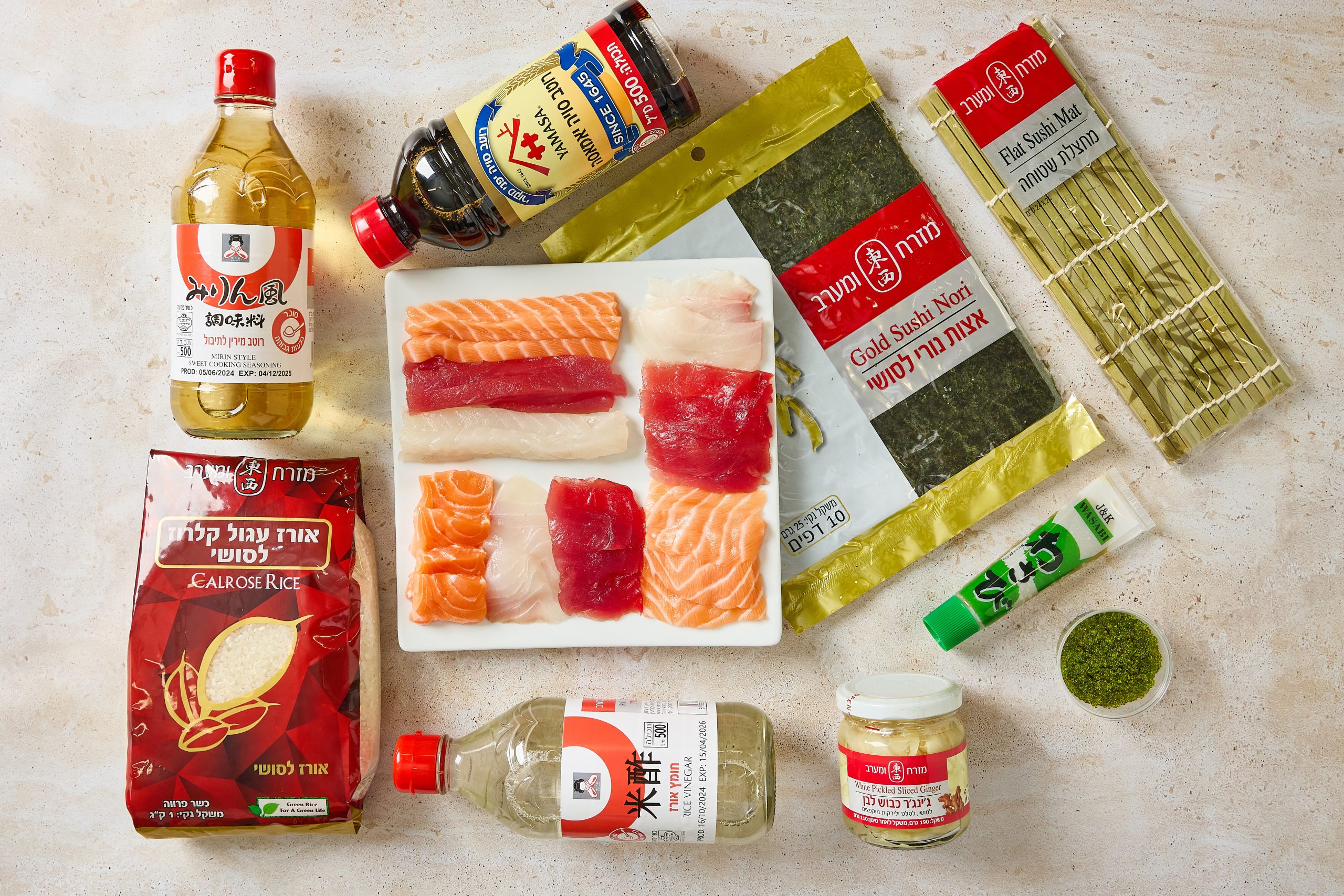 אורז לסושי, חומץ אורז, מירין, סויה, אצות, מחצלת, טוביקו ירוק, וואסבי, ג'ינג'ר, מגש סושי.